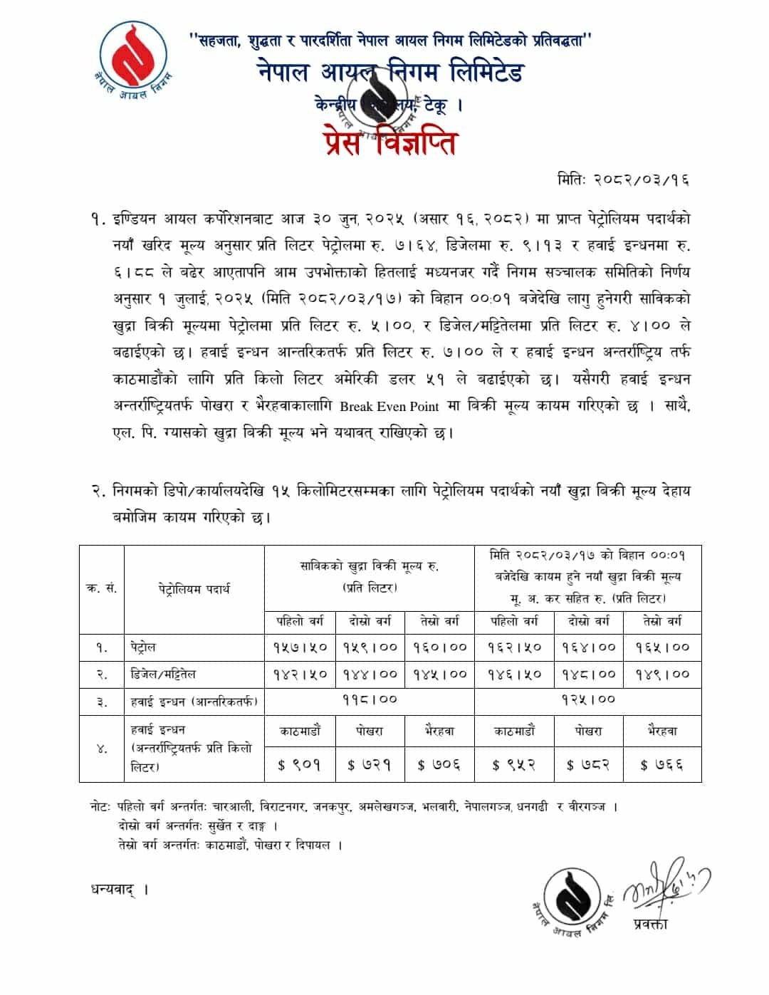 यस्तै, हवाई इन्धन अन्तर्राष्ट्रियतर्फ प्रतिकिलोलिटर अमेरिकी डलर ५१ ले वृद्धि भएको निगमले जनाएको छ ।