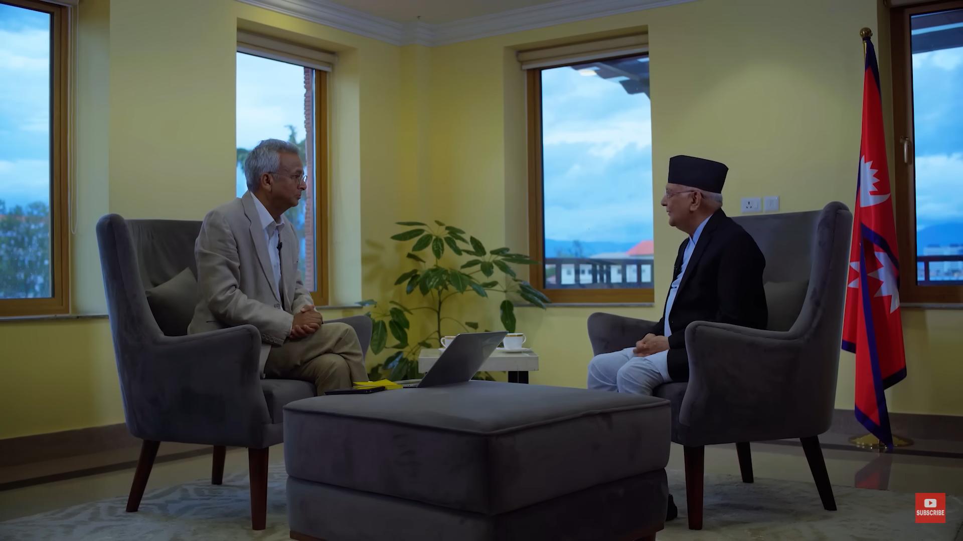 किनभने हाम्रो मुलुकमा अन्तर्वार्ताका दुईवटा शैली विकसित भएका छन् । एउटा अनेक गरेर, अनेक चाकडी गरेर उसलाई अन्तर्वार्ताका निम्ति तयार गर्न ल्याउने, अनि त्यसपछि चिथोर्ने । मलाई मनमा लागेको कुरा भनेको, एउटा चिथोर्ने शैली, अर्को जे पनि मुन्टो हल्याउने, हो हजुर, हो । एस सर, एस म्याडम भनिरहने । म यो दुईवटै काम गर्न अलिकति जाँगर लाग्दैन । उमेरले पनि होला । तथापि आइ फिल गुड द्याट आइ क्यान टक टु युु । सुरुवात म कहाँबाट गर्न चाहन्छु भने प्रधानमन्त्रीज्यू, केही वर्ष अगाडि म अन्नपूर्ण पोष्टमा ग्रुप एडिटर हुँदाखेरी चुनावको बखत थियो । दिउँसो तपार्ईंंसँग यात्रा गर्ने मौका पनि पाएको थिएँ । साँझ दश बजे तपार्ईंंले अन्तर्वार्ता दिनुभएको थियो । तपाईँले सुरुवातमा के भन्नुभयो भने, कि विजय म तिमीलाई हरिभक्त कटुवालको एउटा कविता सुनाउँछु् भन्नु भएको थियो अन्तर्वार्ता सुरु हुनुभन्दा अगाडि, जुनलाई धेरै नजिकबाट नहेर, त्यसमा दाग देखिन्छ है, दाग देखियो भने फेरि फेरि हेर्न मन लाग्दैन भनेर । आज संयोगवस अन्तर्वार्ताको संयोग मिलेको छ । मलाई मनमा के लागिरहेको छ भने, तपार्ईंंलाई के सोधौं, के नसोधौं होइन, संसारमा शब्दहरुको, अन्तर्वार्ताहरुको अर्थहीनता बढ्दैछ, नेपालमा मात्रै होइन । अमेरिकामा त्यत्रो आज बोलेको कुरा भोलि ठेगान छैन, भोलि बोलेको पर्सी ठेगान छैन । कस्तो कस्तो लाग्छ, आजको संसार तपार्ईंंले नियाल्दा, आजको नेपालको परिस्थितिको नेपाल नियाल्दा तपार्ईंंलाई कस्तो महशुस हुन्छ भनेको, यो मैले खाली मनमा आउँदा सोचिराखेको, कहाँ आइपुग्यौं हामीहरु ? संसार अनि नेपाल ? हुन त यहाँ मान्छेहरुलाई चिथोर्ने प्रश्नहरुको अपेक्षा होला । विद्यादेवी भण्डारीको बारेमा तपार्ईंंको के विचार छ, रवि लामिछानेको विषयमा के विचार छ, त्यसलाई एकछिन् पर राखौं । म त्योभन्दा अलिक बृहत् कुराबाट सुरु गर्न चाहन्छु ।
