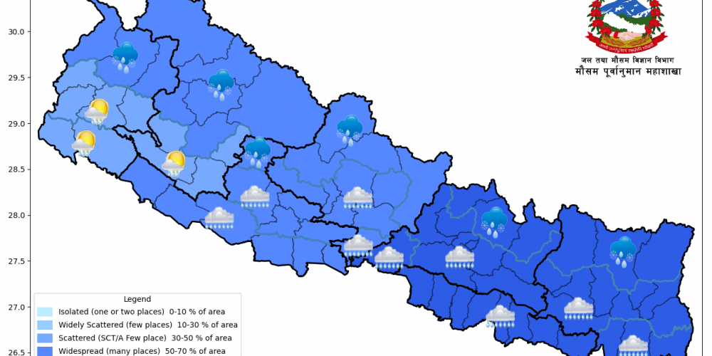 महाशाखाका अनुसार कोशी, मधेश, बागमती, गण्डकी र लुम्बिनी प्रदेशसहितका पहाडी भू–भागमा आज दिउँसो अधिकांश समय बादल लाग्ने छ भने तराईका भू–भागमा सामान्य बदली रहनेछ । कोशी, मधेश र बागमती प्रदेशका धेरै स्थानहरूमा मध्यम वर्षा हुने सम्भावना छ । गण्डकी र लुम्बिनी प्रदेशका पहाडी तथा हिमाली क्षेत्रका केही स्थानमा वर्षा र हिमपातको सम्भावना छ ।