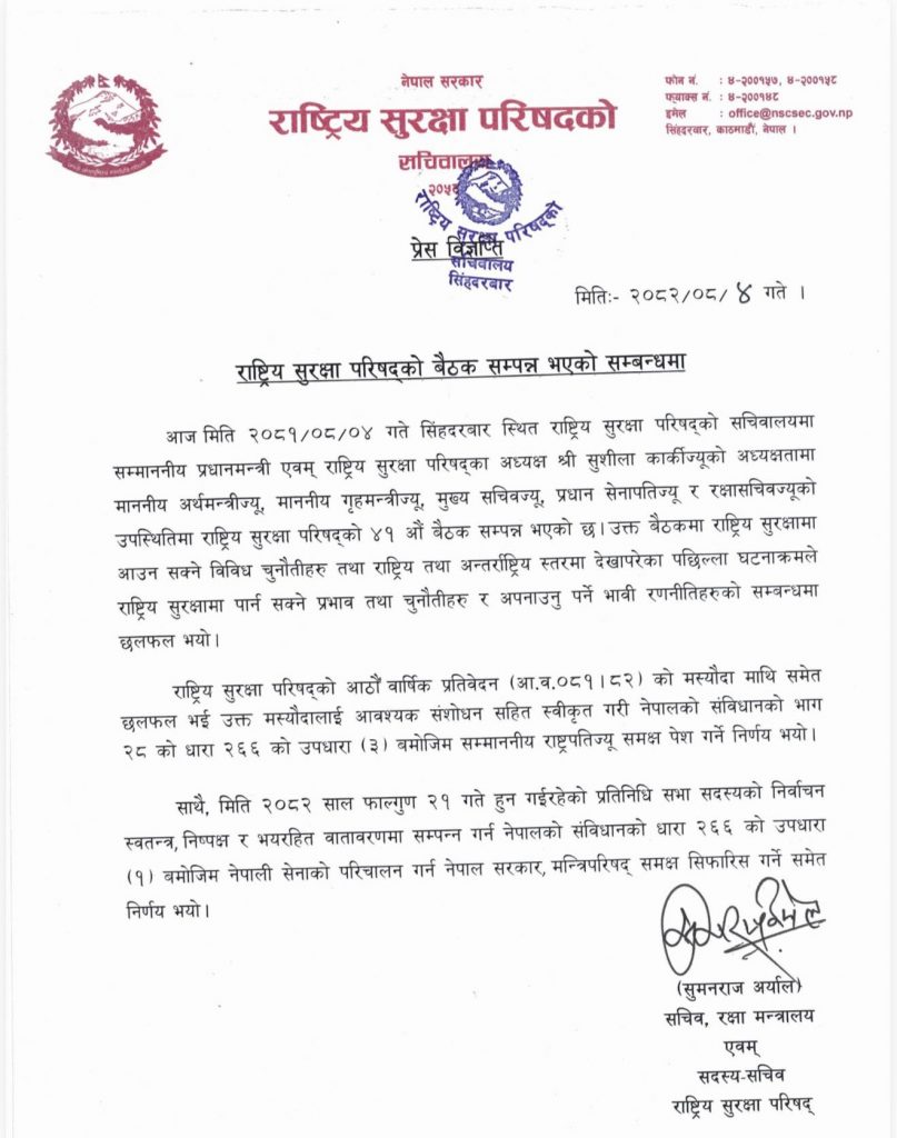 त्यस्तै आगामी फागुन २१ गते हुने प्रतिनिधि सभा निर्वाचनको सुरक्षाका लागि सेना परिचालन गर्न मन्त्रिपरिषद्समक्ष सिफारिस गर्ने निर्णय गरेको विज्ञप्तिमा जनाइएको छ ।