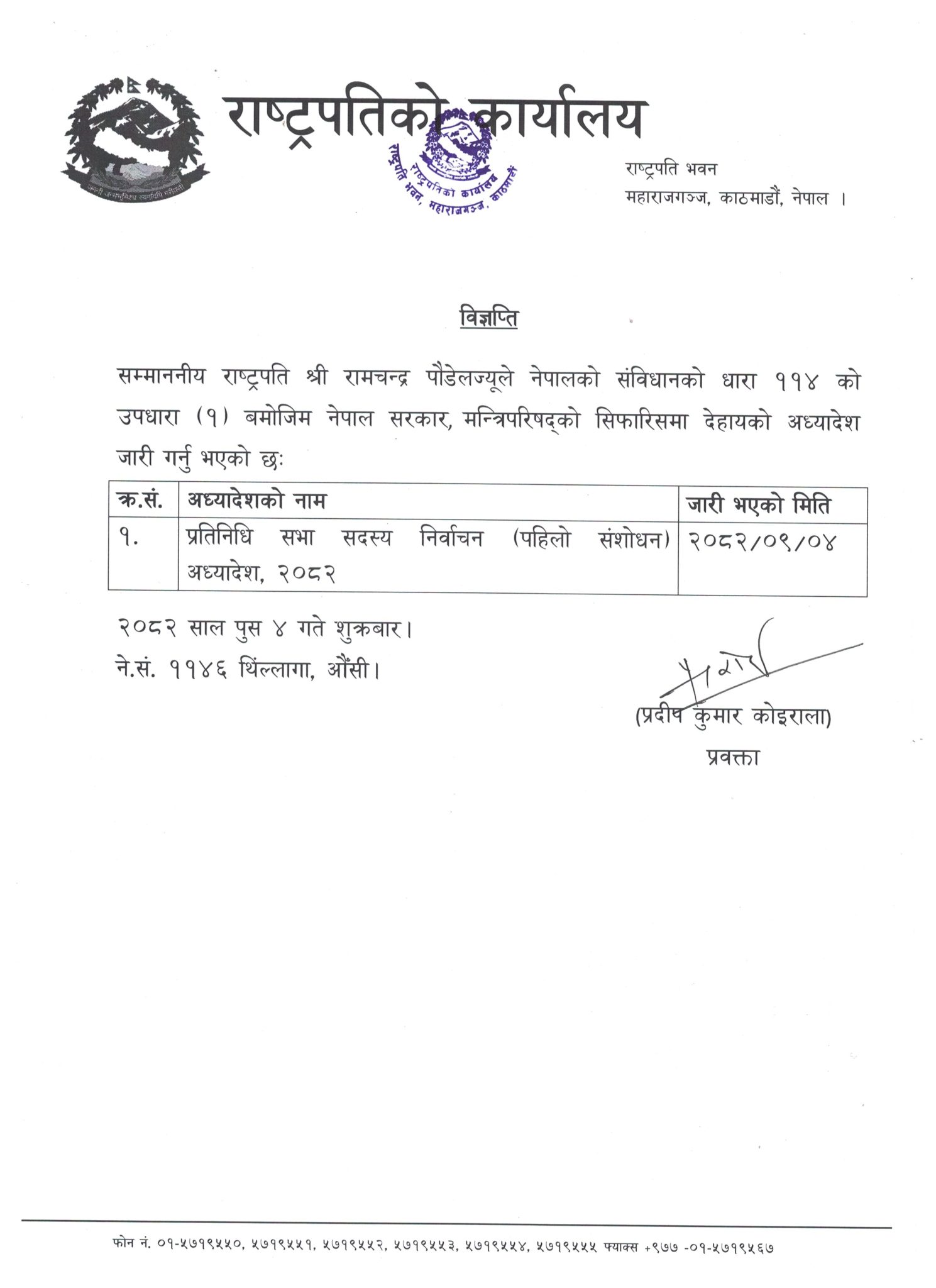 राष्ट्रपति कार्यालयका प्रवक्ता प्रदीपकुमार कोइरालाका अनुसार राष्ट्रपति पौडेलले संविधानको धारा ११४ को उपधारा(१) बमोजिम मन्त्रिपरिषद्को सिफारिसमा सो अध्यादेश जारी गर्नुभएको हो ।