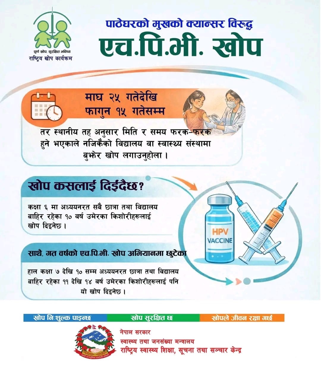 यस वर्षदेखि नियमित खोप कार्यक्रम अन्र्तगत राखेर खोेप अभियान सञ्चालन गर्न लागिएको हो। स्वास्थ्य तथा जनसंख्या मन्त्रालय अन्तर्गतको परिवार कल्याण महाशाखाका खोप शाखा प्रमुख डा अभियान गौतमले ११ देखि १४ वर्ष उमेरका किशोरीलाई पाठेघरको मुखको क्यान्सर विरुद्धको ‘एचपीभी’ खोप लगाउने निर्णय भएको बताए।