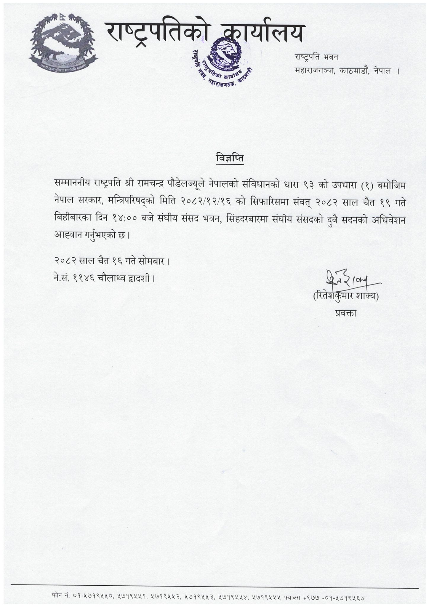 राष्ट्रपति पौडेलले नेपालको संविधानको धारा ९३ को उपधारा (१) बमोजिम नेपाल सरकार, मन्त्रिपरिषद्को सिफारिसमा संवत् २०८२ साल चैत १९ गते बिहीबारका दिन १४:०० बजे संघीय संसद भवन, सिंहदरबारमा संघीय संसदको दुवै सदनको अधिवेशन आह्वान गर्नुभएको राष्ट्रपति कार्यालयले जनाएको छ ।
