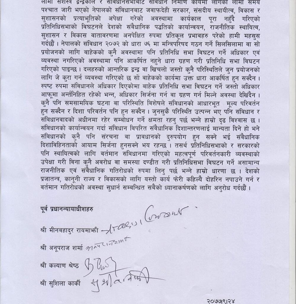 पूर्व प्रधानन्यायाधीशहरू मीनबहादुर रायमाझी, अनुपराज शर्मा, कल्याण श्रेष्ठ र सुशीला कार्कीले शुक्रबार संयुक्त विज्ञप्ति जारी गर्दै ‘यस्तो कार्य फेरि कहिल्यै दोहोरिन नपाउने’ गरी ‘वर्तमान गतिरोधको अवस्था सुधार्न’ सम्बन्धित सबैको ध्यानाकर्षण गराएका छन्।