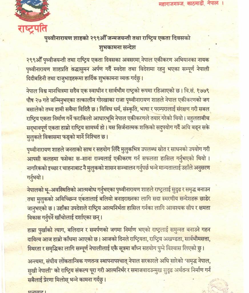 गोरखाका राजा पृथ्वीनारायणले नेपाल एकीकरणको जग बसालेको तथा विविध धर्म, संस्कृति, भाषा र परम्परालाई संरक्षण गरी सबल राष्ट्रिय एकता निर्माण गर्ने फराकिलो आधारभूमि नेपाल एकीकरणले तयार गरेको जनाउँदै राष्ट्रपतिले बहुलताबीच सद्भावपूर्ण एकता हाम्रो राष्ट्रिय सामर्थ्यको सदुपयोग गर्दै अघि बढ्न सके मुलुकले विकासमा फड्को मार्ने विश्वास व्यक्त गर्नुभएको छ ।