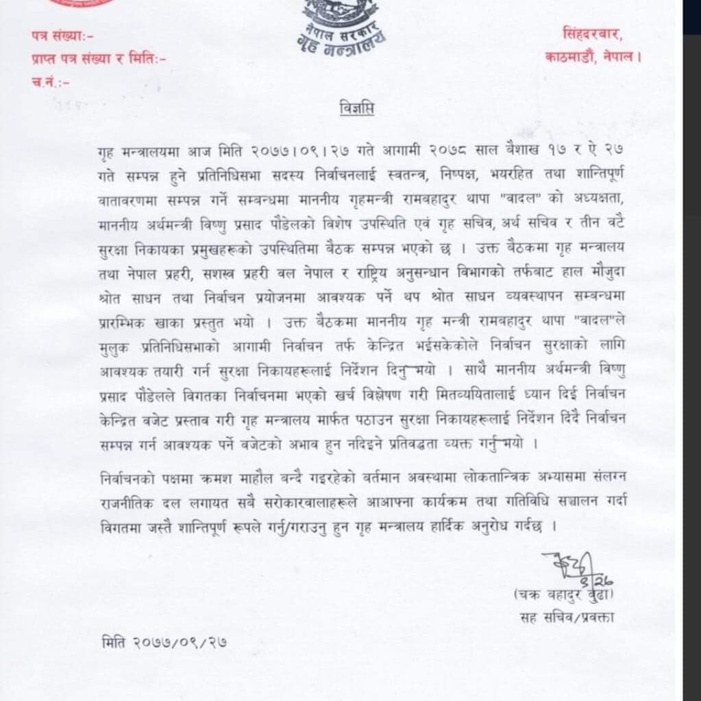 आगामी बैशाख १७ र २७ गते हुने प्रतिनिधिसभा सदस्य निर्वाचनलाई स्वतन्त्र, निष्पक्ष, भयरहित र शान्तिपूर्ण रुपमा सञ्चालन गर्नेसम्बन्धी गृहमन्त्री रामबहादुर थापा ‘बादल’ को अध्यक्षतामा बैठक सपम्न्न भएको मन्त्रालयका सह–सचिव एवं प्रवक्ता चक्रबहादुर बुढाद्वारा जारी विज्ञप्तिमा जनाइएको छ ।