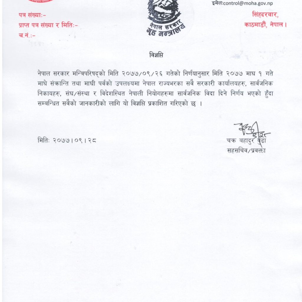 मन्त्रिपरिषदको पुस २६ गतेको निर्णयअनुसार देशभरका सबै सरकारी कार्यालयहरु, सार्वजनिक निकायहरु, संघ संस्था र विदेशस्थित नेपाली नियोगहरुमा सार्वजनिक बिदा दिने निर्णय भएको गृह मन्त्रालयले जनाएको छ ।