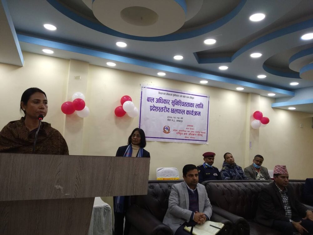 राष्ट्रिय बाल अधिकार परिषद्का कार्यकारी निर्देशक मिलनराज घरेलको अध्यक्षतामा भएको कार्यक्रममा विभिन्न पालिकाका प्रमुख, उपप्रमुख, जिल्ला समन्वय समितिका प्रमुख तथा उपप्रमुखहरूले बालबालिकाको विषयमा भएको कामकाज तथा समस्याहरूको बारेमा प्रकाश पार्नुभएको थियो । –रासस