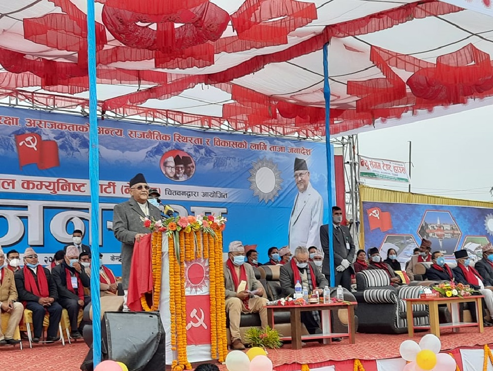 नेकपा चितवनले भरतपुरमा आज आयोजना गरेको जनसभालाई सम्बोधनका क्रममा प्रधानमन्त्री ओलीले पूर्व प्रधानमन्त्रीहरू झलनाथ खनाल, माधव नेपाल र पुष्पकमल दाहाललाई इङ्गित गर्नुहुँदै उहांँहरुले बुढेसकालमा लौरो टेकेर पार्टी ध्वस्त पार्न र देशलाई बरबाद गर्ने बाटोमा लागेको आरोप लगाउनुभयो ।