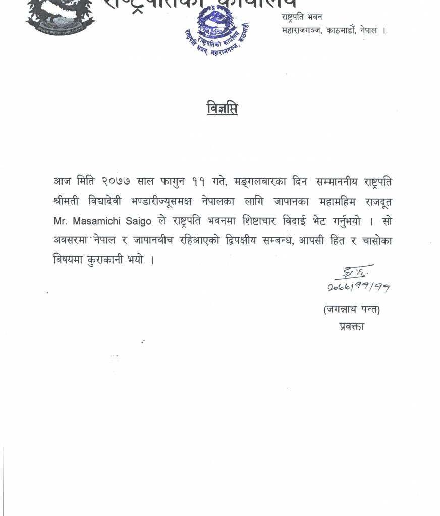 भेटमा नेपाल र जापानबिच रहिआएको द्विपक्षीय सम्बन्ध, आपसी हित र चासोका विषयमा कुराकानी भएको राष्ट्रपति कार्यालयका प्रवक्ता जगन्नाथ पन्तद्वारा जारी विज्ञप्तिमा जनाइएको छ ।