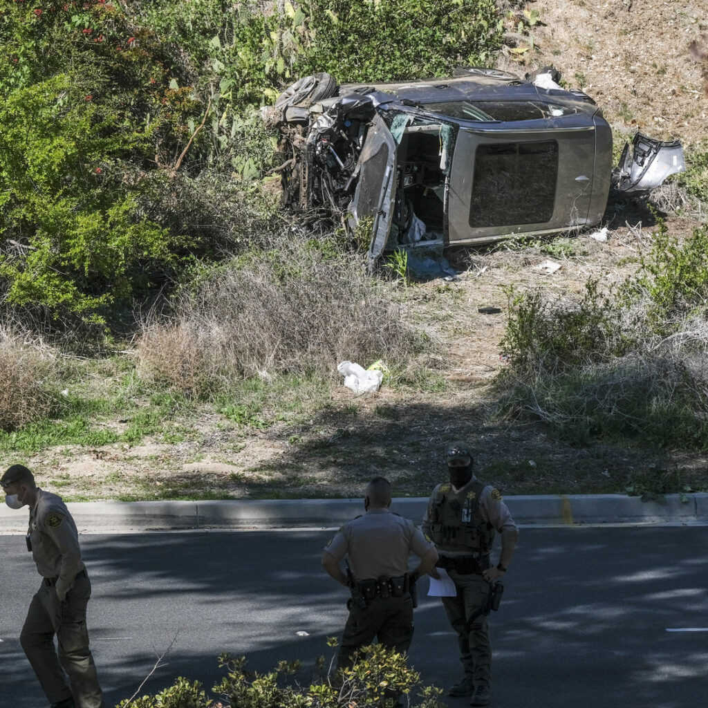 A vehicle rests on its side after a rollover accident involving golfer Tiger Woods along a road in the Rancho Palos Verdes section of Los Angeles on Tuesday, Feb. 23, 2021. Woods suffered leg injuries in the one-car accident and was undergoing surgery, authorities and his manager said. (AP Photo/Ringo H.W. Chiu)