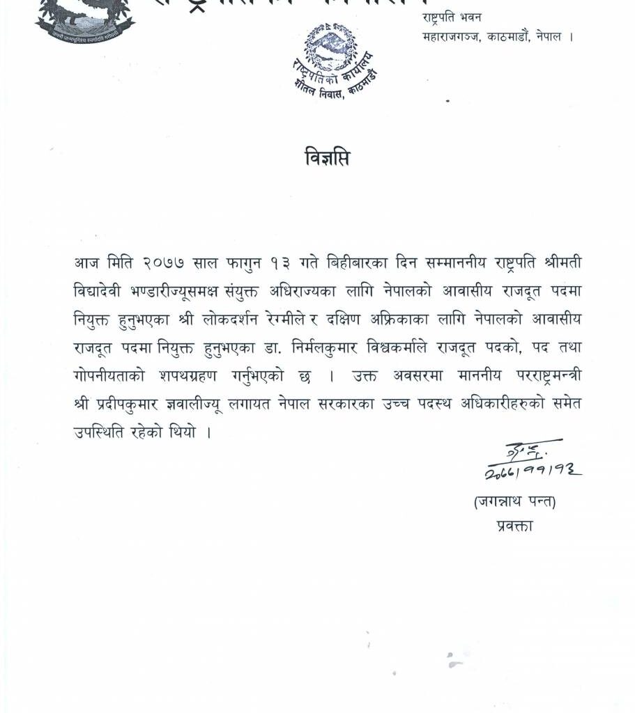 राष्ट्रपति भवन शीतल निवासमा विहिवार आयोजित विशेष समारोहमा उहाँहरुले शपथ लिनुभएको हो । सो अवसरमा परराष्ट्रमन्त्री प्रदीपकुमार ज्ञवालीलगायत नेपाल सरकारका उच्चपदस्थ अधिकारीको उपस्थिति रहेको राष्ट्रपतिको कार्यालयले जनाएको छ ।