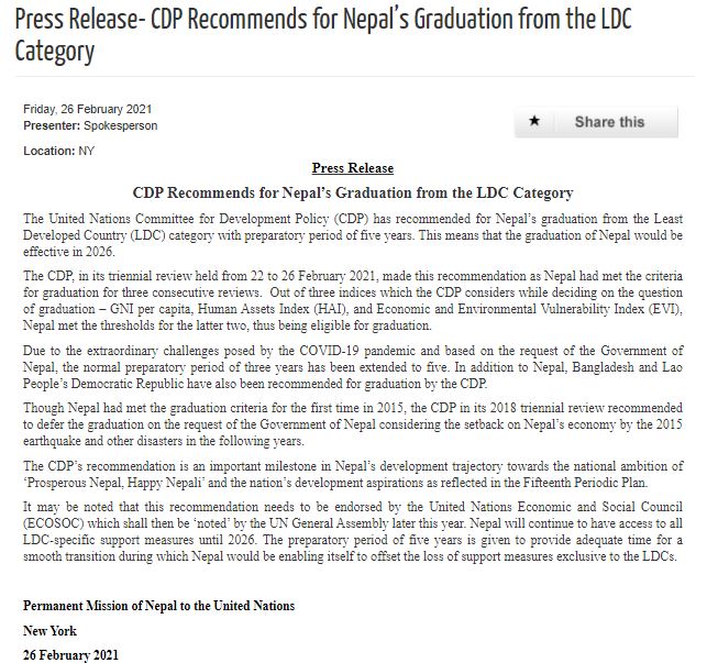 सो समितिले हरेक तीन वर्षमा गर्ने समीक्षाका लागि बैठक यही वर्षको फेब्रुअरी २२ देखि २६ सम्म बसेको र सो बैठकमा नेपालले स्तरोन्नतिका लागि तोकिएका मापदण्ड पछिल्ला तीन समीक्षामा लगातार हासिल गरेको निष्कर्ष निकालेपछि नेपाललाई सन् २०२६ देखि लागु हुने गरी स्तरोन्नति गर्ने सिफारिस गरिएको हो।