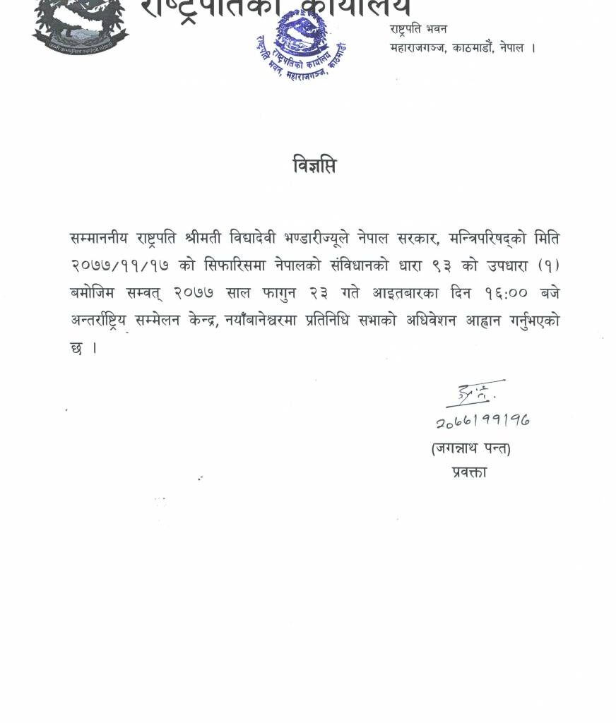 नेपाल सरकारका सिफारिशमा नेपालको संविधानको धारा ९३ को उपधारा (१) बमोजिम सो अधिवेशन आह्वान गरिएको राष्ट्रपतिको कार्यालयका प्रवक्ता जगन्नाथ पन्तले विज्ञप्तिमार्फत आज जनाउनुभएको छ ।