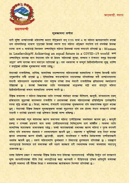 एक सय ११ औँ अन्तर्राष्ट्रिय श्रमिक महिला दिवसका अवसरमा एक शुभकामना सन्देश दिँदै प्रधानमन्त्री ओलीले ऐतिहासिक जनआन्दोलन लगायतका परिवर्तनका सबै आन्दोलनहरुमा नेपाली महिलाहरुले अग्रमोर्चामा रहेर नेतृत्व गरेको तथ्य नेपाली राजनीतिक इतिहासमा स्वर्णाक्षरले लेखिएको बताउनुभयो । उहाँले देशको विकासका लागि जनसंख्याको आधाभन्दा बढी भाग ओगट्ने महिला दिदीबहिनीहरुको समान सहभागिता अत्यन्त जरुरी भएको उल्लेख गर्नुभएको छ ।