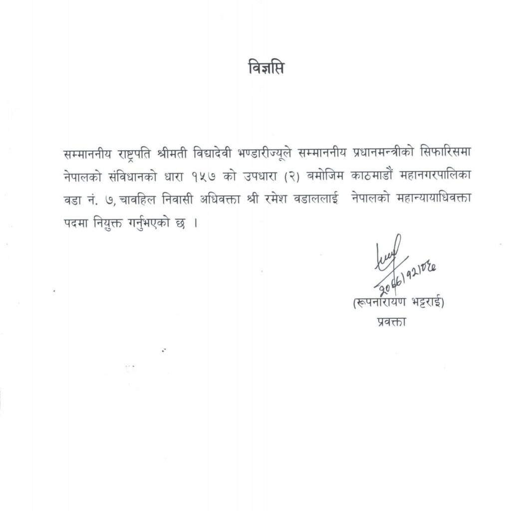 राष्ट्रपति विद्यादेवी भण्डारीले प्रधानमन्त्रीका सिफारिशमा नेपालको संविधानको धारा १५७ को उपधारा (२) बमोजिम काठमाडौँ महानगरपालिका–७, चाबहिल निवासी अधिवक्ता रमेश बडाललाई नेपालका महान्यायाधिवक्तामा नियुक्त गर्नुभएको छ ।