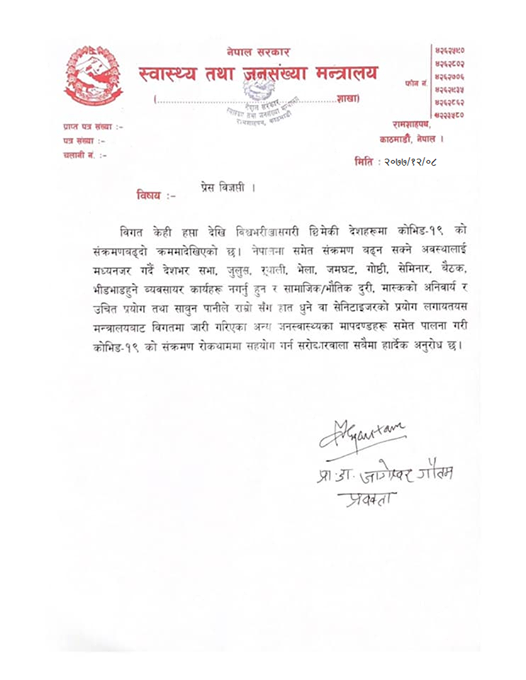 स्वास्थ्य तथा जनसङ्ख्या मन्त्रालयले छिमेकी देश हुँदै नेपाल भित्रने सीमा नाकामा स्वास्थ्य मापदण्डको पालना तथा सङ्क्रमणको जाँच गर्न सम्बन्धित निकायलाई निर्देशन गरेको छ ।