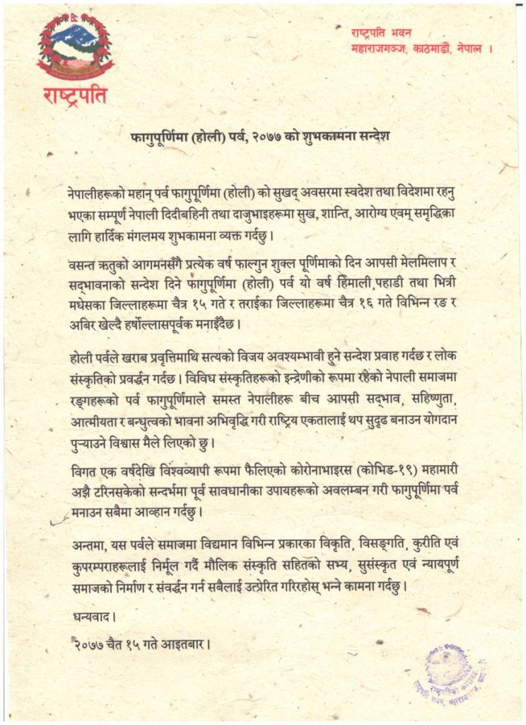 सन्दशेमा राष्टपतिले विगत एक वर्षदेखि विश्वव्यापी रूपमा फैलिएको कोरोनाभाइरस (कोभिड –१९) महामारी अझै टरिनसकेको भन्दै पूर्व सावधानीका उपायहरूको अवलम्बन गरी फागुपूर्णिमा पर्व मनाउन आग्रह गर्नुभएको छ ।
