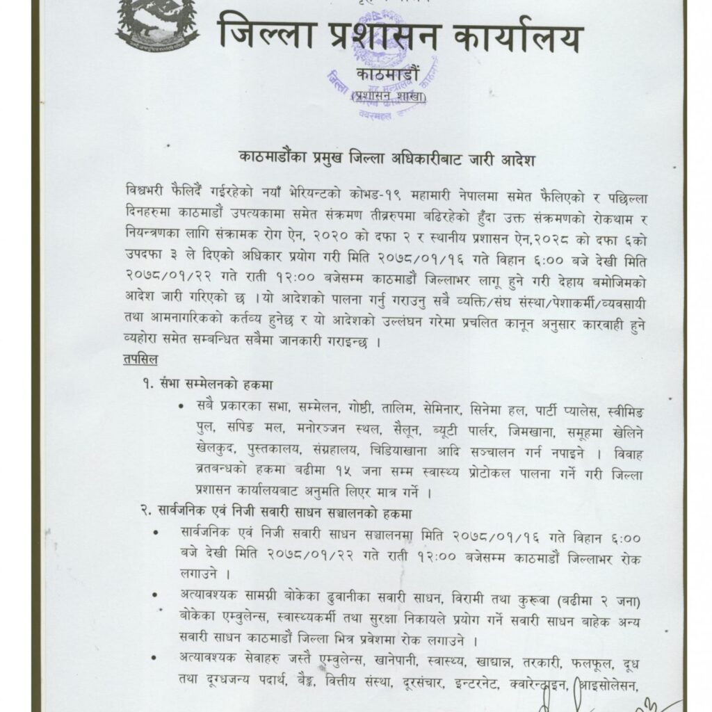 नयाँ भेरियन्टको कोभिड–१९ महामारी नेपालमा समेत फैलिएको र पछिल्ला दिनहरूमा काठमाडौँ उपत्यकामा समेत संक्रमण तीव्र रूपमा बढिरहेको हुँदा उक्त संक्रमणको रोकथाम र नियन्त्रणका लागि संकामक रोग ऐन, २०२० को दफा २ र स्थानीय प्रशासन ऐन, २०२८ को दफा ६ को उपदफा ३ ले दिएको अधिकार प्रयोग गरी मिति २०७८/०१/१६ गते बिहान ६:०० बजे देखी मिति २०७८/०१/२२ गते राती १२:०० बजेसम्म काठमाडौँ जिल्लाभर लागू हुने जारी आदेशमा भनिएको छ ।