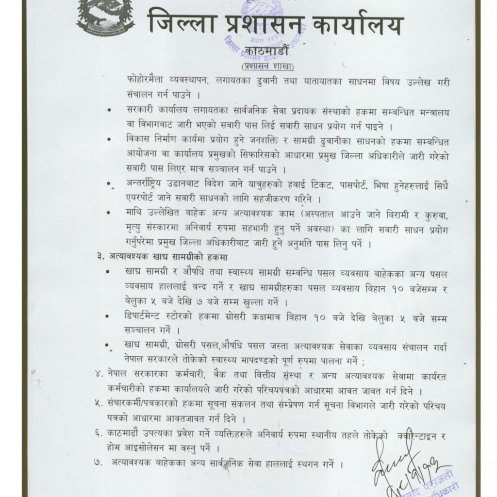 आज काठमाडौँ, भक्तपुर र ललितपुर जिल्लाका प्रमुख जिल्ला अधिकारीहरूको बैठकले सो आदेश जारी गरी अत्यावश्यक सेवाबाहेकका सेवा बन्द गर्ने निर्णय गरेको हो ।