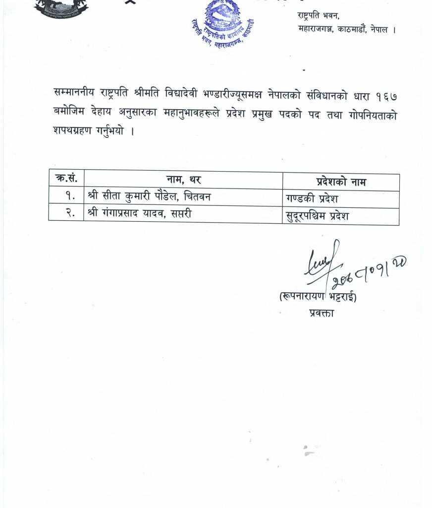 राष्ट्रपति विद्यादेवी भण्डारीले नवनियुक्त गण्डकी प्रदेश प्रमुख सीता कुमारी पौडेल र सुदूरपश्चिम प्रदेशका प्रमुख गङ्गाप्रसाद यादवलाई पद तथा गोपनीयताको शपथ ग्रहण गराउनुभएको छ ।