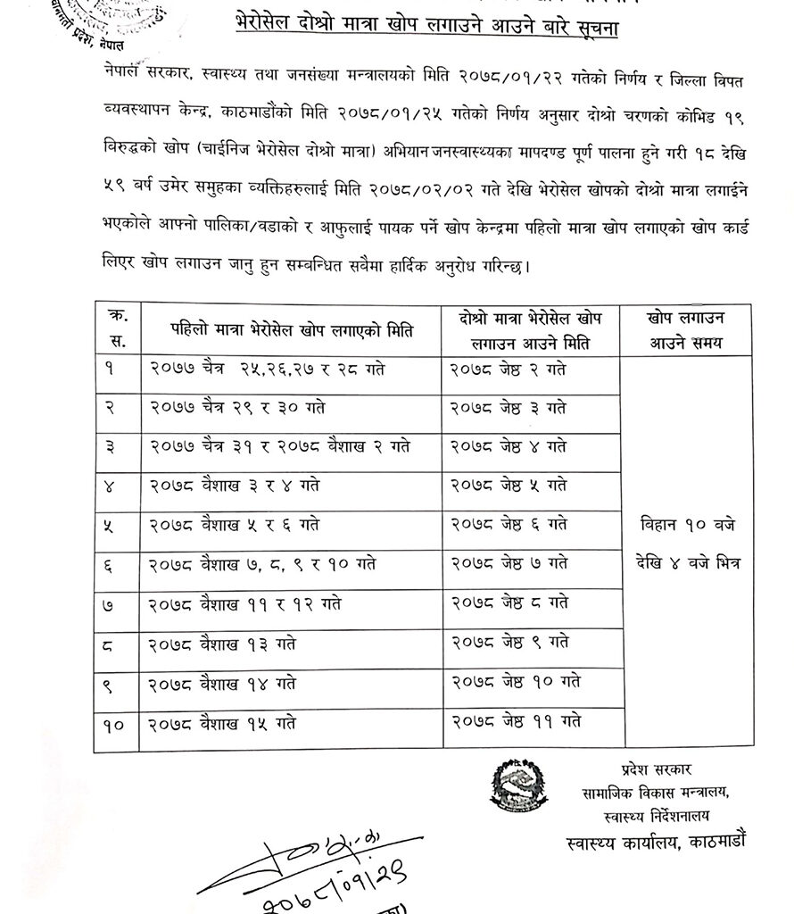 उक्त निर्णयअनुसार वाग्मती प्रदेशको सामाजिक विकास मन्त्रालयले खोप तालिका सार्वजनिक गरेको छ । दोस्रो डोज खोप लगाउन पहिलो डोज खोप लगाएको खोप कार्ड लिएर जानुपर्नेछ ।