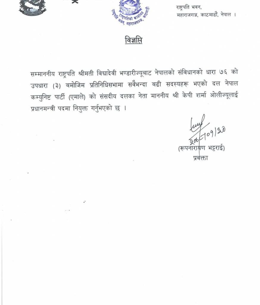 राष्ट्रपति विद्यादेवी भण्डारीले नेकपा एमाले संसदीय दलका नेता केपी शर्मा ओली प्रधानमन्त्री नियुक्त हुनुभएको छ । संविधानको धारा ७६(३) अनुसार संसदको सबभन्दा ठुलो दलको संसदीय दलको नेता ओलीलाई राष्ट्रपतिले आज प्रधानमन्त्रीमा नियुक्त गर्नुभएको हो ।
