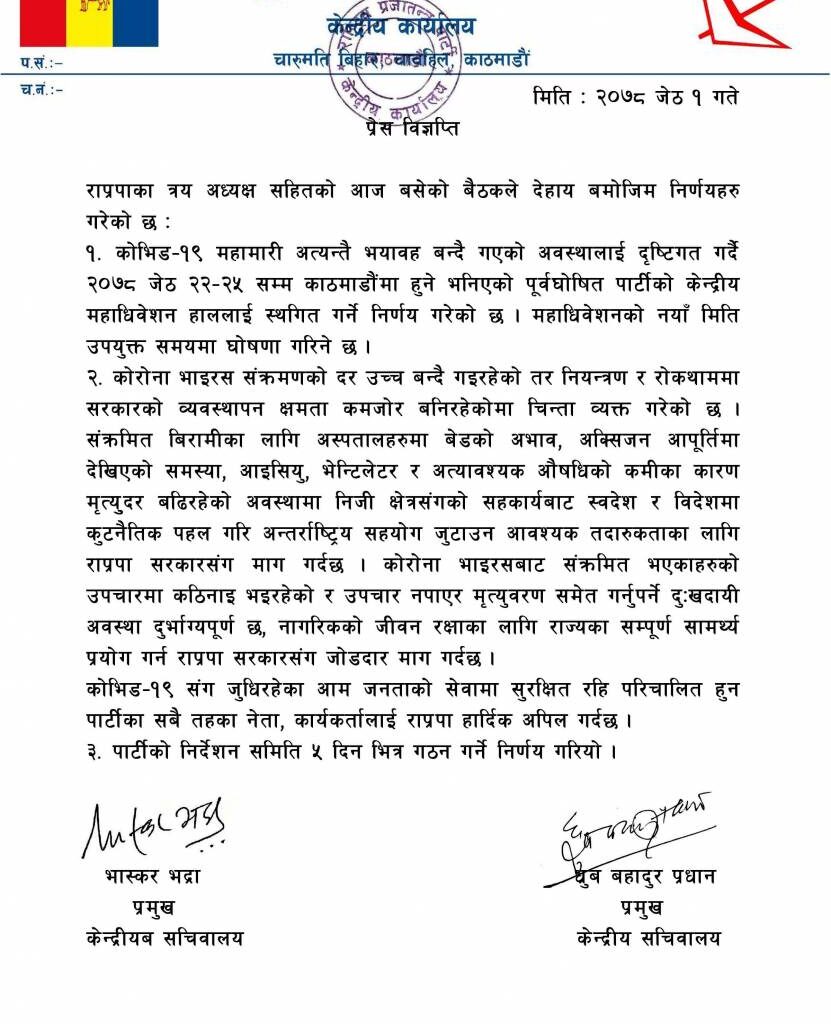 १. कोभिड–१९ महामारी अत्यन्तै भयावह बन्दै गएको अवस्थालाई दृष्टिगत गर्दै २०७८ जेठ २२–२५ सम्म काठमाडौंमा हुने भनिएको पूर्वघोषित पार्टीको केन्द्रीय महाधिवेशन हाललाई स्थगित गर्ने निर्णय गरेको छ । महाधिवेशनको नयाँ मिति उपयुक्त समयमा घोषणा गरिने छ ।