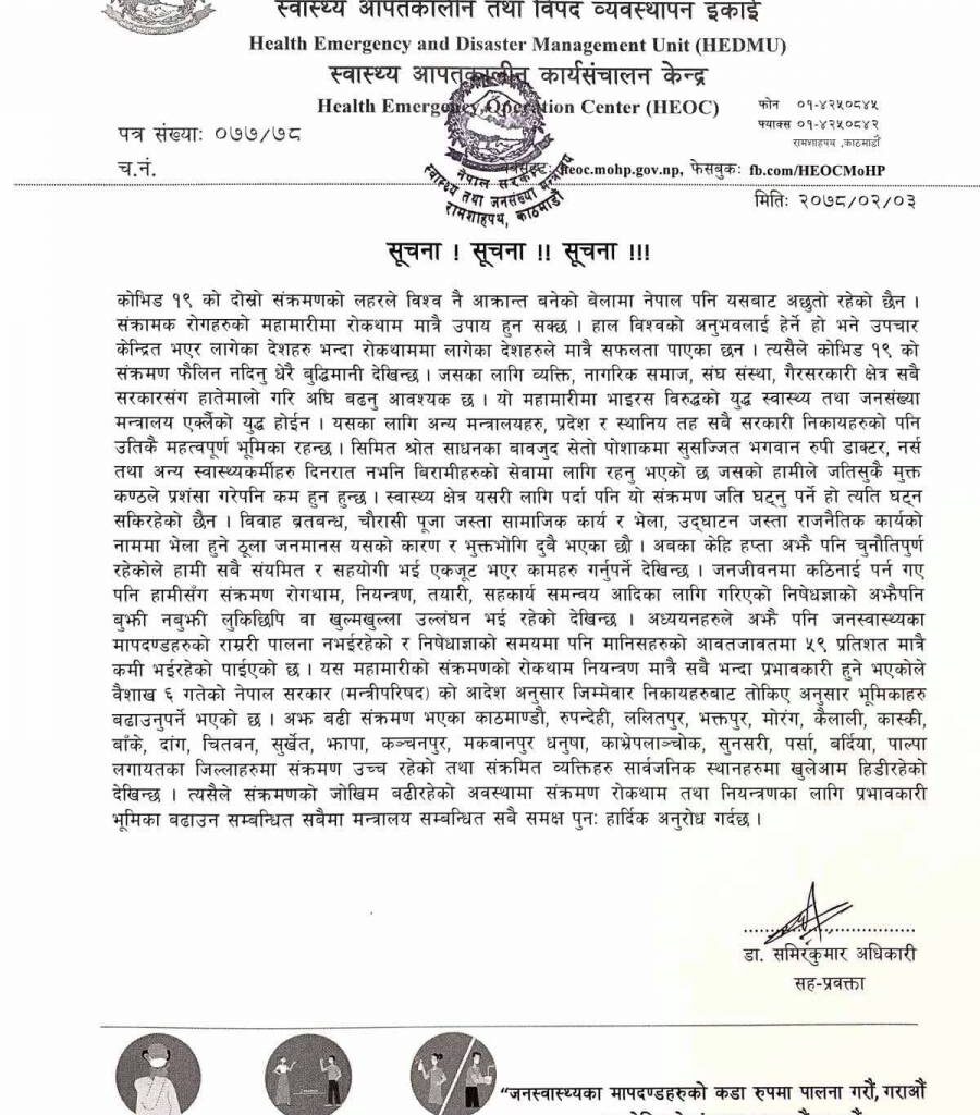 यसैगरी स्वास्थ्य तथा जनसङ्ख्या मन्त्रालयले अबको केही हप्ता अझै पनि चुनौतीपूर्ण रहेकाले संयमित र सहयोगी भई एकजुट भएर काम गर्नुपर्ने जनाएको छ ।आज एक सूचना जारी गर्दै मन्त्रालयले निषेधाज्ञाको समयमा जनस्वास्थ्यका मापदण्ड पालना नभएको र मानिसहरूको आवतजावतमा ५९ प्रतिशत मात्र कमी भएको जनाएको हो ।