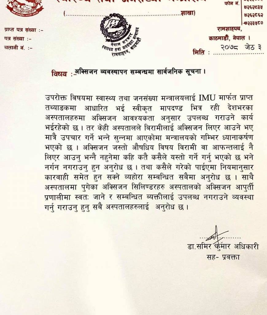 मन्त्रालयले आज सार्वजनिक सूचना जारी गर्दै अक्सिजन जस्तो औषधीय विषय बिरामी वा आफन्तलाई नै लिएर आउनु भन्नै नहुनेमा कहीँ कतै कसैले गरेको पाइएमा नियमानुसार कारबाही गरिने जनाएको हो ।