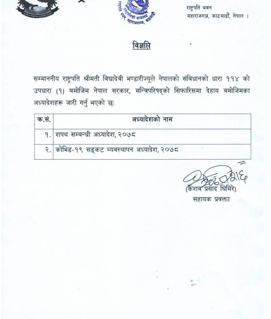 नेपालको संविधान बमोजिम मन्त्रीपरिषद्को सिफारिसमा राष्ट्रपति भण्डारीले शपथ सम्बन्धी अध्यादेश २०७८ र कोभिड–१९ सङ्कट व्यवस्थापन अध्यादेश २०७८ जारी गर्नुभएको राष्ट्रपति कार्यालयका सहायक प्रवक्ता केशव प्रसाद घिमिरेद्वारा जारी विज्ञप्तिमा जनाइएको छ ।
