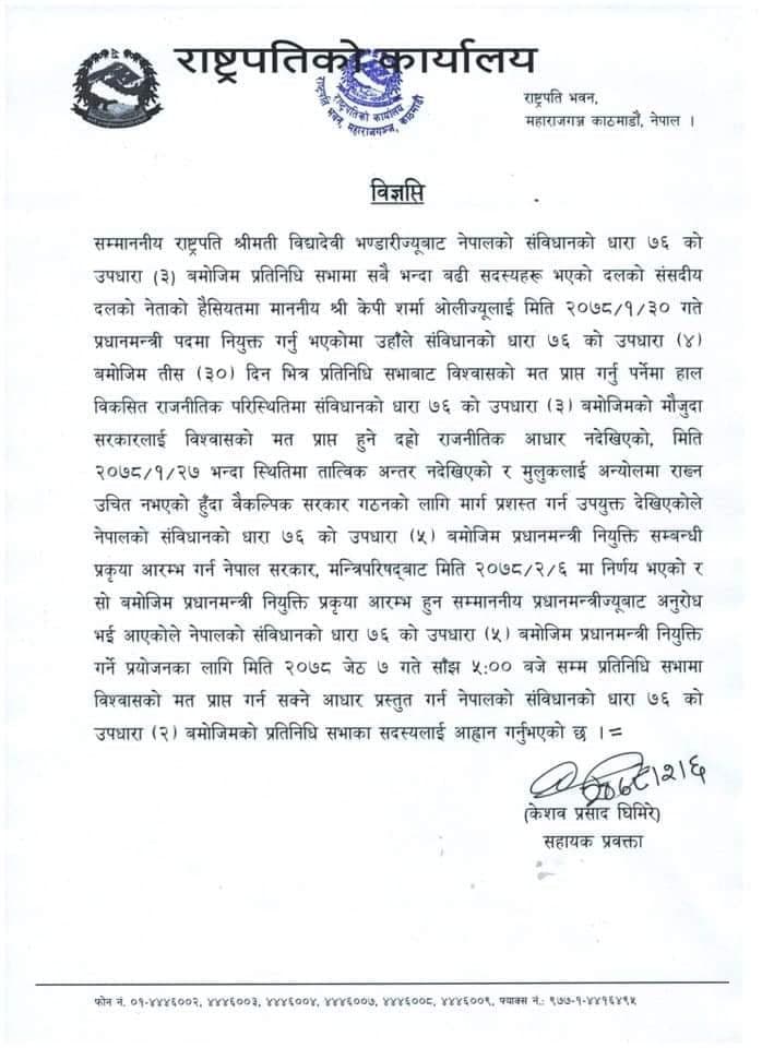 प्रधानमन्त्री केपी शर्मा ओलीले सविंधानको धारा ७६(४) अनुसार ३० दिनभित्र विश्वासको मत लिनुपर्ने तर अहिलेको राजनैतिक घटनाक्रम अनुसार विश्वासको मत प्राप्त गर्ने आधार नरहेको ले धारा ७६(५) अनुसार प्रक्रिया अघि बढाउने भन्ने आजको मन्त्रीपरिषद्को निर्णय अनुसार राष्ट्रपतिले वैकल्पिक सरकारको लागि आह्वान गर्नु भएको विज्ञप्तिमा जनाइएको छ ।