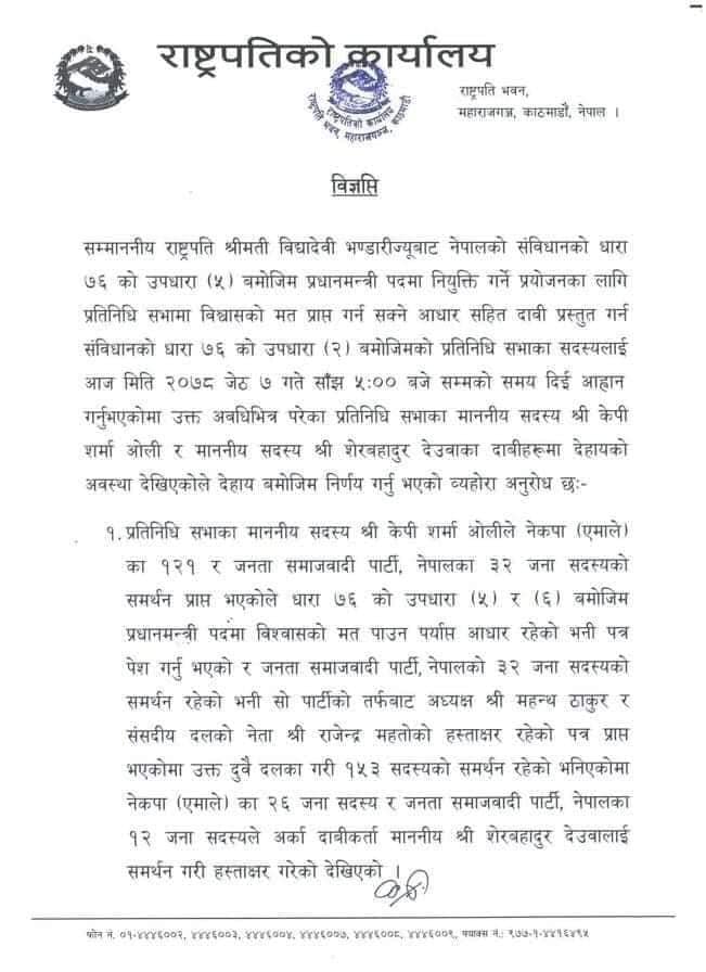 राष्ट्रपतिले शुक्रबार साँझ ५ बजेसम्म प्रधानमन्त्रीमा दावी गर्न प्रतिनिधिसभा सदस्यलाई आह्वान गर्नुभएको थियो ।