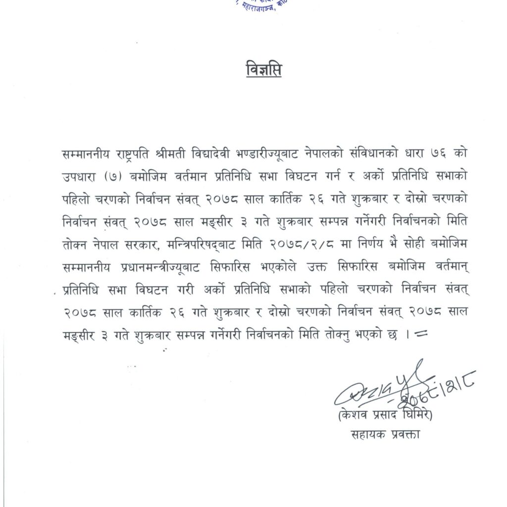 मन्त्रिपरिषदको सिफारिसमा शनिबार बिहान राष्ट्रपतिले प्रतिनिधि सभा विघटन गर्दै अर्को प्रतिनिधि सभाको पहिलो चरणको निर्वाचन २०७८ साल कार्तिक २६ गते शुक्रबार र दोस्रो चरणको निर्वाचन मङ्सीर ३ गते शुक्रबार सम्पन्न गर्नेगरी निर्वाचनको मिति तोक्नुभएको छ ।