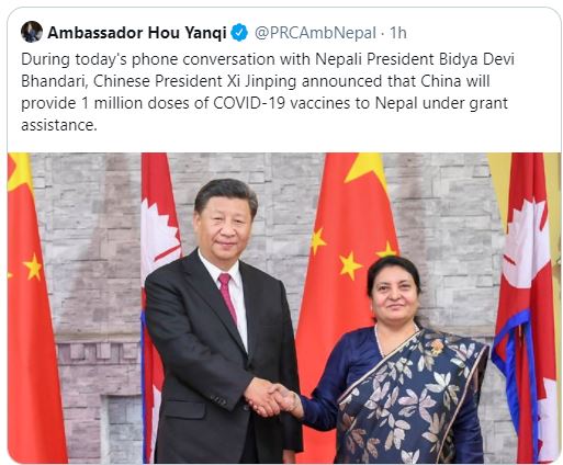 चिनियाँ राष्ट्रपति सी चिङफिङले राष्ट्रपति विद्यादेवी भण्डारीसँग आज टेलिफोन मार्फत कुरा गर्नुहुँदै नेपाललाई कोरोना सङ्क्रमणको दोस्रो लहर विरुद्ध लड्न १० लाख खोप प्रदान गर्ने घोषणा गर्नुभएको नेपालका लागी चीनका राजदूत हाउ याङ्छीले एक ट्विट मार्फत जानकारी दिनु भयो ।