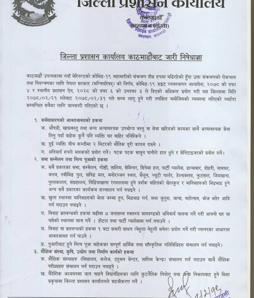 होटल तथा पार्टी प्यालेसमा गर्न नपाउने, विवाह वा व्रतबन्धको हकमा १ वटा सवारी साधन (बेहुला बेहुली समेत) प्रयोग गर्ने गरी ब्यानरका आधारमा आवतजावत गर्न पाउन , पुजारीबाट हुने नित्य पूजा बाहेकका सम्पूर्ण धार्मिक तथा सांस्कृतिक गतिविधिहरू सञ्चालन गर्न नपाइने जनाइएको छ ।त्यस्तै शैक्षिक संस्था, कृषि, उद्योग तथा निर्माण कार्यको हकमा क. शैक्षिक संस्थाहरू (विद्यालय, कलेज, ट्युसन सेन्टर, तालिम केन्द्र) सञ्चालन गर्न गराउन साथै शैक्षिक परीक्षाहरू सञ्चालन गर्न गराउन नपाइने, वैदेशिक अध्ययनमा जान चाहने विद्यार्थीहरूका लागि कूटनैतिक नियोग तथा अन्य निकायबाट हुने भिसा प्रक्रियामा जिल्ला प्रशासन कार्यालयले सहजीकरण गर्ने, नेपाल सरकारबाट जारी स्वास्थ्य मापदण्डको पूर्ण परिपालना गरी कूटनीतिक नियोगले अति आवश्यक परीक्षा तथा अन्तर्वार्ता गर्न सक्ने र सो कार्यका लागि जिल्ला प्रशासन कार्यालयले सहजीकरण गर्ने, अत्यावश्यक उद्योग सञ्चालन तथा निर्माण कार्यका लागि स्वास्थ्य सुरक्षा मापदण्डको पालना गर्ने गरी कार्यस्थलमा नै श्रमिक कामदारको आवासीय व्यवस्था गरी सञ्चालन गर्ने जनाइएको छ ।