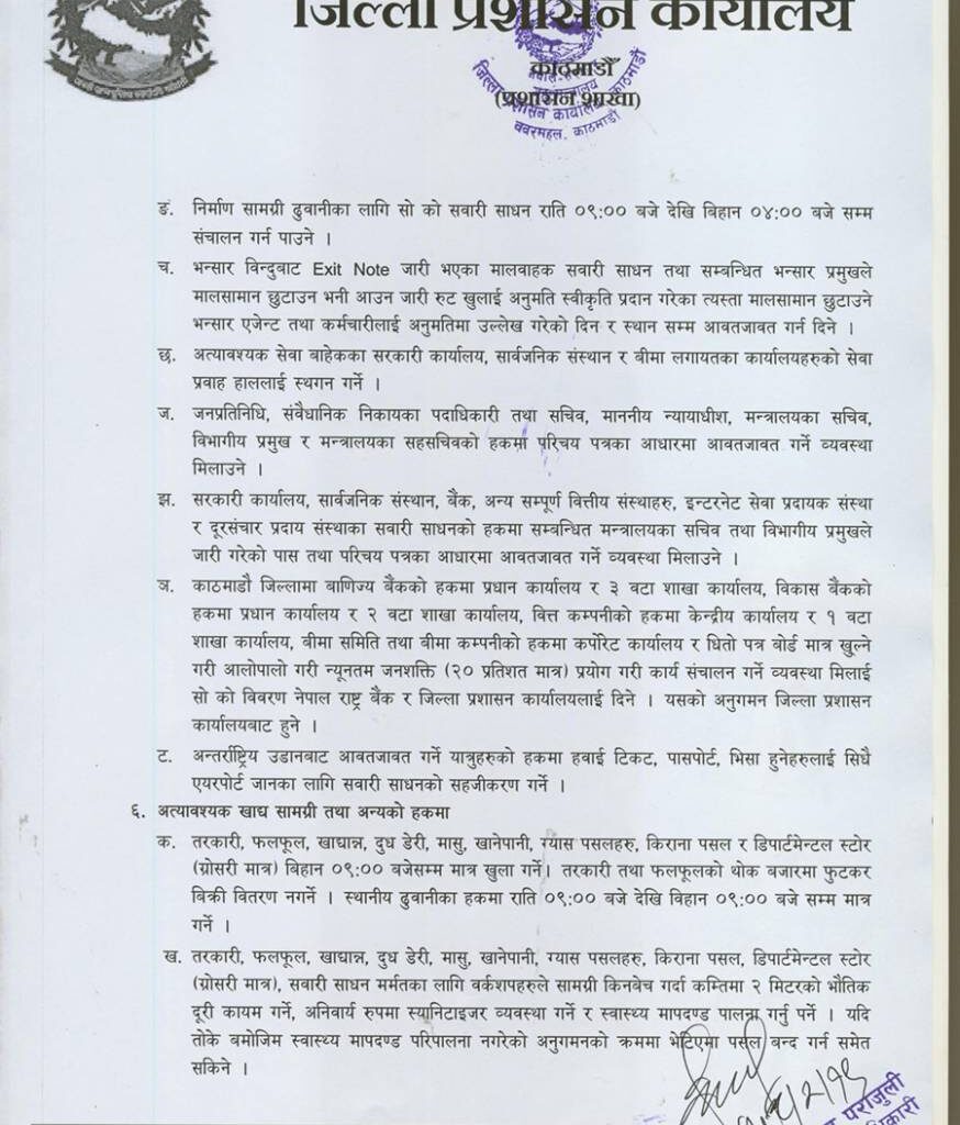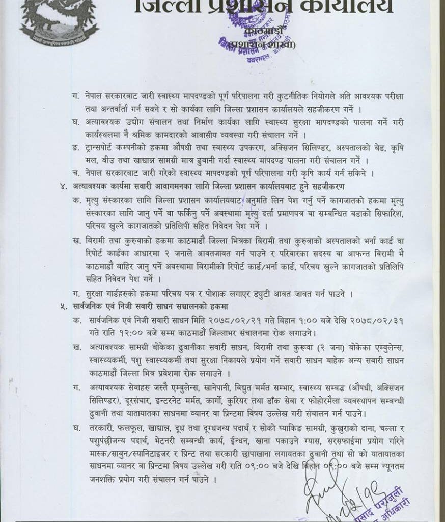 त्यस्तै अत्यावश्यक कार्यमा सवारी आवागमनका लागि जिल्ला प्रशासन कार्यालयबाट हुने सहजीकरण क. मृत्यु संस्कारका लागि जिल्ला प्रशासन कार्यालयबाट अनुमति लिन पेस गर्नु पर्ने कागजातको हकमा मृत्यु संस्कारका लागि जानु पर्ने वा फर्किनु पर्ने अवस्थामा मृत्यु दर्ता प्रमाणपत्र वा सम्बन्धित वडाको सिफारिस, परिचय खुल्ने कागजातको प्रतिलिपि सहित निवेदन पेस गर्ने, बिरामी तथा कुरुवाको हकमा काठमाडौँ जिल्ला भित्रका बिरामी तथा कुरुवाको अस्पतालको भर्ना कार्ड वा रिपोर्ट कार्डका आधारमा २ जनाले आवतजावत गर्न पाउने र परिवारका सदस्य वा आफन्त बिरामी भई काठमाडौँ बाहिर जानु पर्ने अवस्थामा बिरामीको रिपोर्ट कार्ड/भर्ना कार्ड, परिचय खुल्ने कागजातको प्रतिलिपिसहित निवेदन पेस गर्ने, सुरक्षा गार्डहरूको हकमा परिचय पत्र र पोसाक लगाएर ड्युटी आवत जावत गर्न पाउने बताइएको छ ।