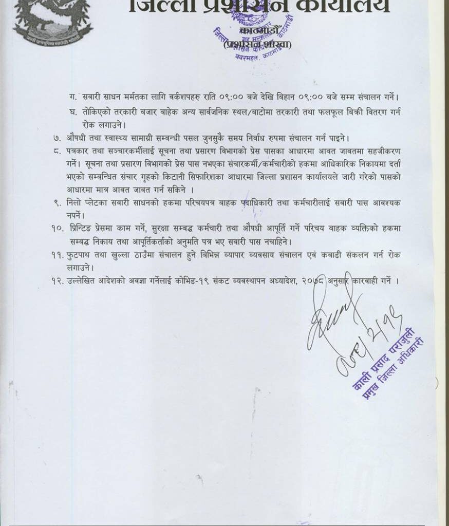 त्यसैगरी ट्रान्सपोर्ट कम्पनीको हकमा औषधी तथा स्वास्थ्य उपकरण, अक्सिजन सिलिण्डर, अस्पतालको बेड, कृषि मल, बीउ तथा खाद्यान्न सामग्री मात्र ढुवानी गर्दा स्वास्थ्य मापदण्ड पालना गरी सञ्चालन गर्ने । नेपाल सरकारबाट जारी गरेको स्वास्थ्य मापदण्डको पूर्ण परिपालना गरी कृषि कार्य गर्न सकिने छ  ।