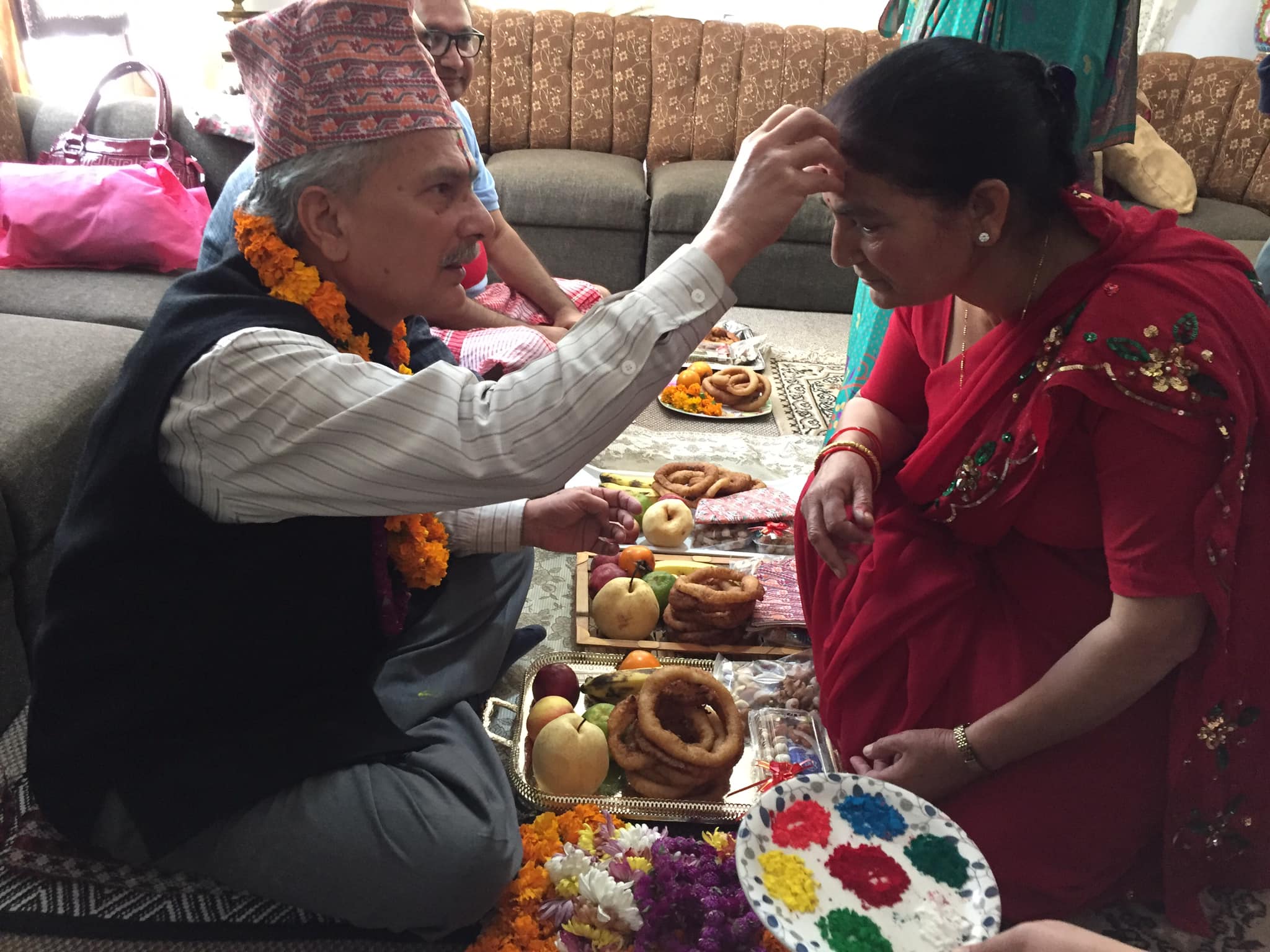 टीका लगाइदिएपछि बहिनीले भट्टराईलाई मखमलीको माला लगाई कटुुस, ओखर र मिठाई खुवाएर वात्सल्य प्रस्तुत गरेका थिए । भट्टराईले बहिनीलाई टीका लगाइदिएर दक्षिणा तथा स्नेहोपहार पनि प्रदान गरेका थिए ।