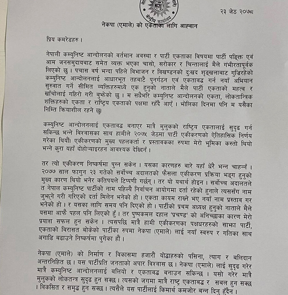आज नेकपा (एमाले) को आन्तरिक जीवनमा समस्याहरू देखा परेका छन् । ती समस्याहरूबाट पार्टी पङ्क्ति मात्रै होइन, राजनीतिक स्थिरता र लोकतन्त्रका पक्षधर आम जनसमुदाय समेत चिन्तित छन् । परिस्थितिको गाम्भीर्यलाई ध्यानमा राखेर पार्टी अध्यक्षका हैसियतले मैले एकताका निम्ति गरेको अथक प्रयास र निरन्तर पहलबारे यहाँहरू सबै परिचित हुनुहुन्छ । तर हाम्रा अनवरत प्रयासका बाबजुद जे नहुनुपथ्र्यो, त्यही भइरहेको छ । जे हुनु पर्थ्यो, त्यो भने भइरहेको छैन ।