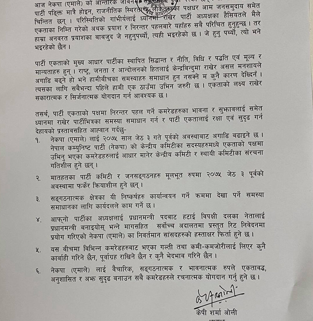 एमालेका नेताहरू झलनाथ खनाल, माधवकुमार नेपालसहितका नेताहरू असन्तुष्ट भई पार्टी विभाजनको स्थितिमा पुगेका बेला अध्यक्ष एवं प्रधानमन्त्री ओलीले आज छ बुँदे प्रस्तावसहित सबैलाई पार्टी एकतामा आउन आह्वान गर्नुभएको हो ।