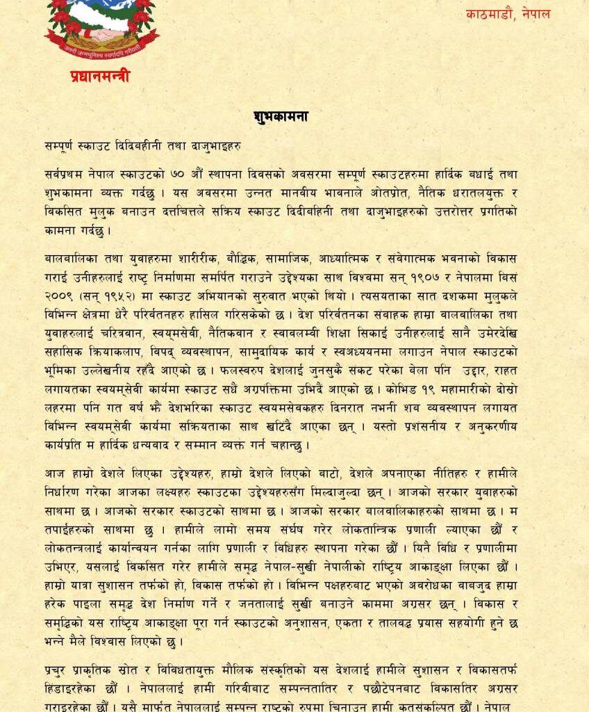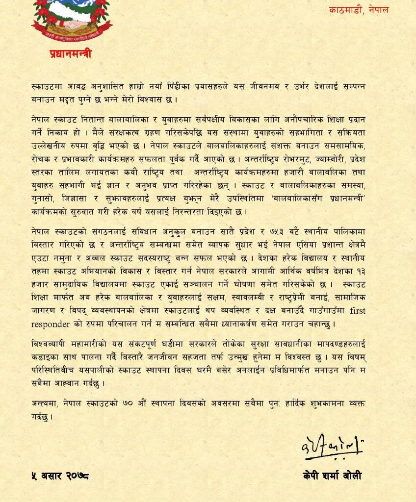 नेपाल स्काउट को ७० औँ स्थापना दिवसको अवसरमा आज एक शुभकामना सन्देश दिनुहुँदै प्रधानमन्त्री ओलीले देशले लिएको बाटो र उद्देश्यहरूसँग स्काउटका उद्देश्यहरू मिलेको भन्दै युवा तथा बालबालिकाको पक्षमा सरकार सधैँ रहने बताउनुभएको हो ।
