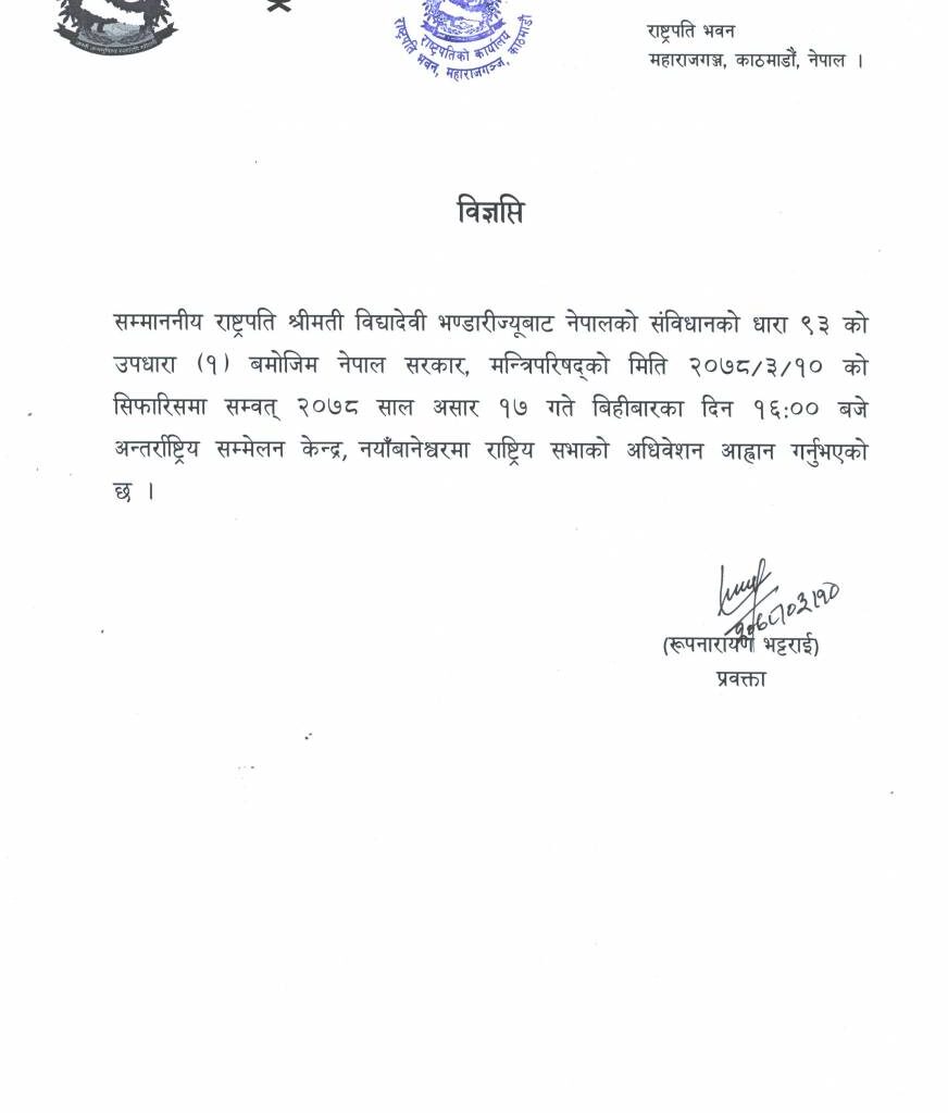 राष्ट्रपतिले समयसमयमा दुवै वा कुनै सदनको अधिवेशन आह्वान गर्ने संवैधानिक व्यवस्था छ । गत पुसमा प्रतिनिधिसभा विघटन गर्ने सरकारको निर्णयअघि प्रतिनिधिसभा र राष्ट्रियसभाका अधिवेशन एकै पटक आह्वान हुँदैआएंको थियो ।