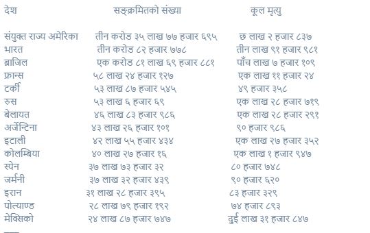 सो विश्वविद्यालयले जुन २३ मा प्रकाशित गरेको विवरणअनुसार कोरोनाबाट अत्यन्त प्रभावित पन्ध्र देशका सङ्क्रमित र यस सङ्क्रमणबाट ज्यान गुमाएका नागरिकहरुको संख्या यसप्रकार रहेका छन् ।