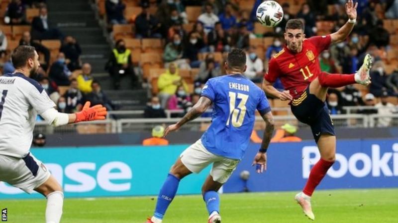 युईएफए नेसन्स लिग ए च्याम्पियन्सको पहिलो सेमिफाइनल खेलमा स्पेनले इटालीलाई पराजित गरेको छ ।