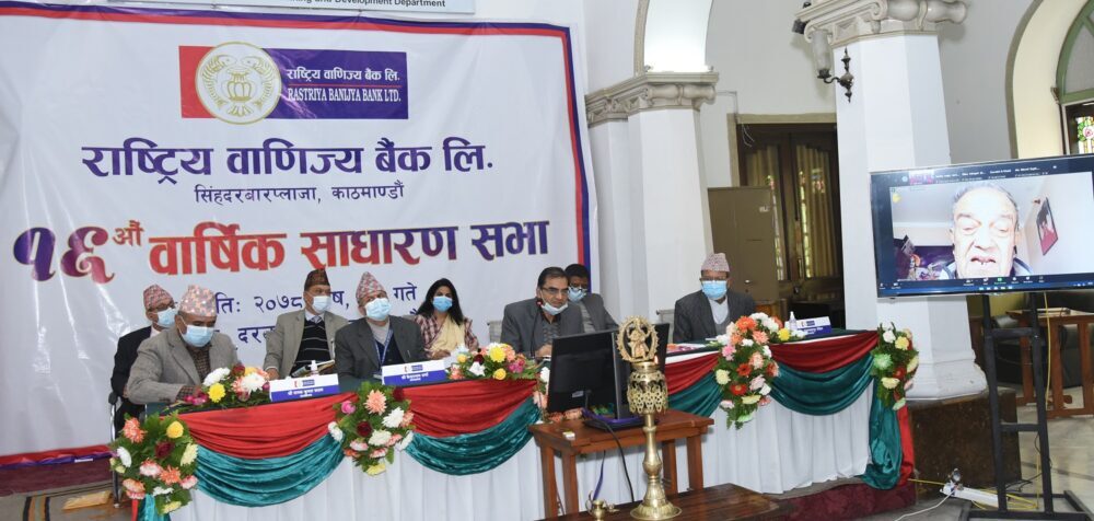 राष्ट्रिय वाणिज्य बैंक लिमिटेडको १६ औं वार्षिक साधारणसभा बिहीबार सम्पन्न भएको छ । साधारणसभाले ३३ प्रतिशत लाभांश(नगद ३ नगद र बोनस शेयर ३० प्रतिशत) सहितको आ.व. २०७७÷०७८ को वार्षिक प्रतिवेदन र विभिन्न प्रस्तावहरू पारित गरेको छ ।