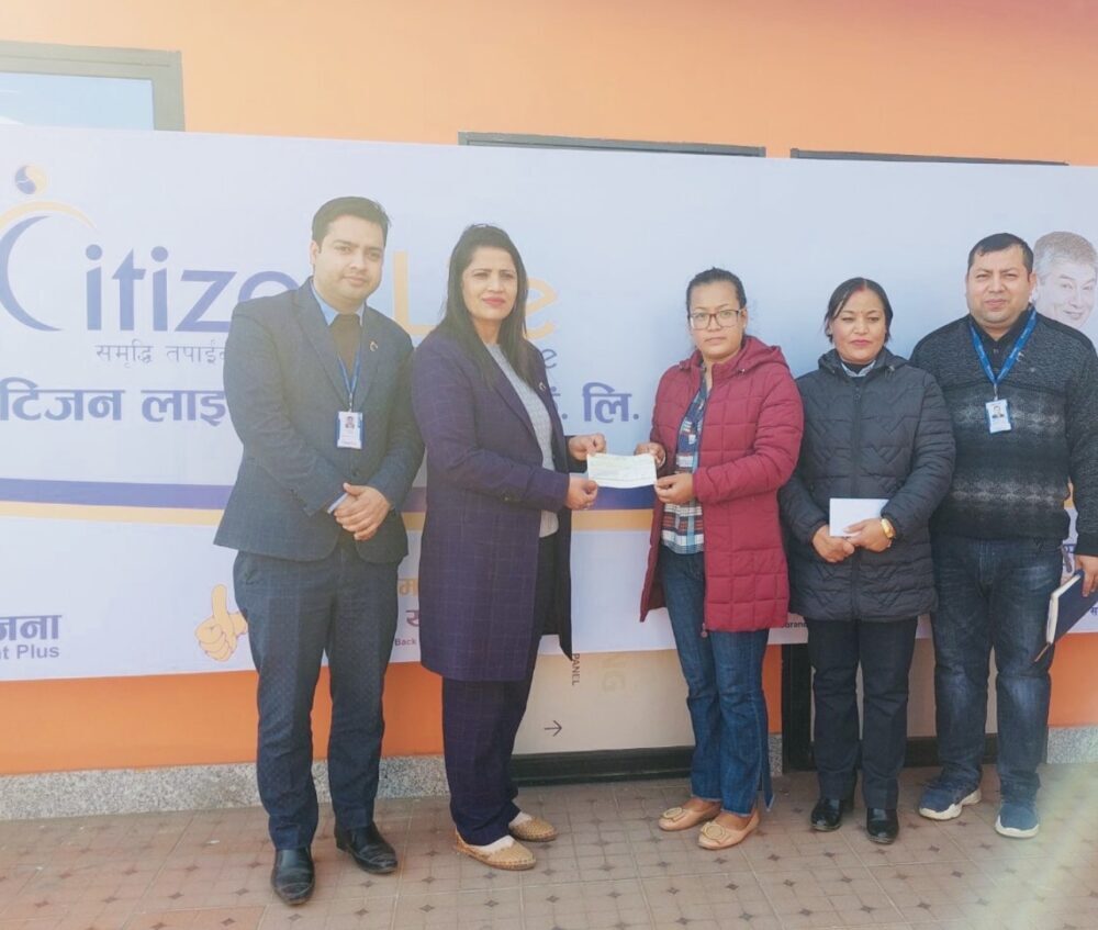 सिटिजन लाइफ इन्स्योरेन्स कम्पनीको बानेश्वर शाखाद्वारा बीमितका परिवारलाई जीवन बीमा बापतको बीमा दाबी रकम हस्तान्तरण गरिएको छ।
