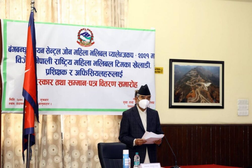 प्रधानमन्त्री देउवाले शुक्रवार बालुवाटारमा सेन्ट्रल जोन विजेता महिला भलिबल टोलीलाई नगदसहित पुरस्कृत गर्नुभएको हो ।