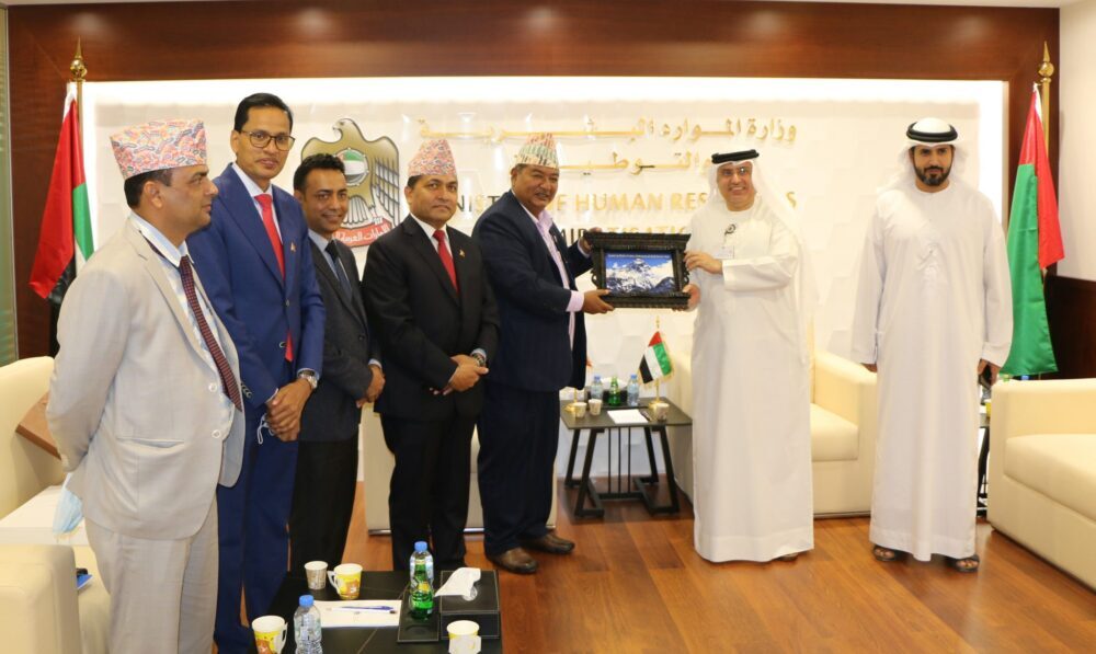 युएईको राजधानी आबुधावीस्थित मानव संशाधन मन्त्रालयमा भएको भेटवार्तामा उहाँहरुबीच दुई देशको आपसी सम्बन्ध र युएईमा कार्यरत नेपाली श्रमिकको हितका विषयमा छलफल भएको श्रम मन्त्रालयले जनाएको छ ।