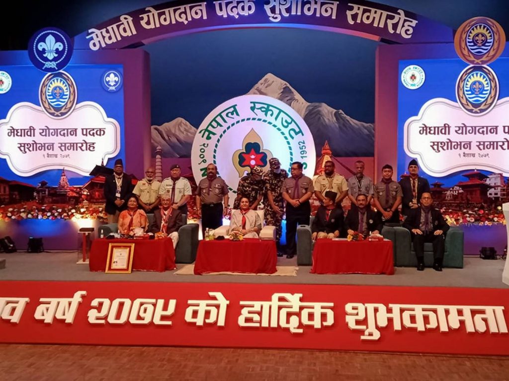 राष्ट्रपति विद्यादेवी भण्डारीले पूर्वप्रधानमन्त्री एवं नेकपा (एमाले)का अध्यक्ष केपी शर्मा ओलीलाई विश्व स्काउट सङ्गठन, एसिया प्रशान्त क्षेत्रको ठूलो मानिने ‘मेधावी योगदान पदक’ प्रदान गर्नुभएको छ । नेपाल स्काउटद्वारा आज आयोजित समारोहमा राष्ट्रपति भण्डारीबाट सो पदक प्रदान गरिएको हो । प्रधानमन्त्री रहँदा नेपाल स्काउटको अभियान विकास, विस्तार र प्रवर्द्धनमार्फत बालबालिका तथा युवाको सर्वपक्षीय विकासमा पुर्याएको योगदानको कदर गर्दै ओलीलाई सो पदक प्रदान गरिएको हो ।